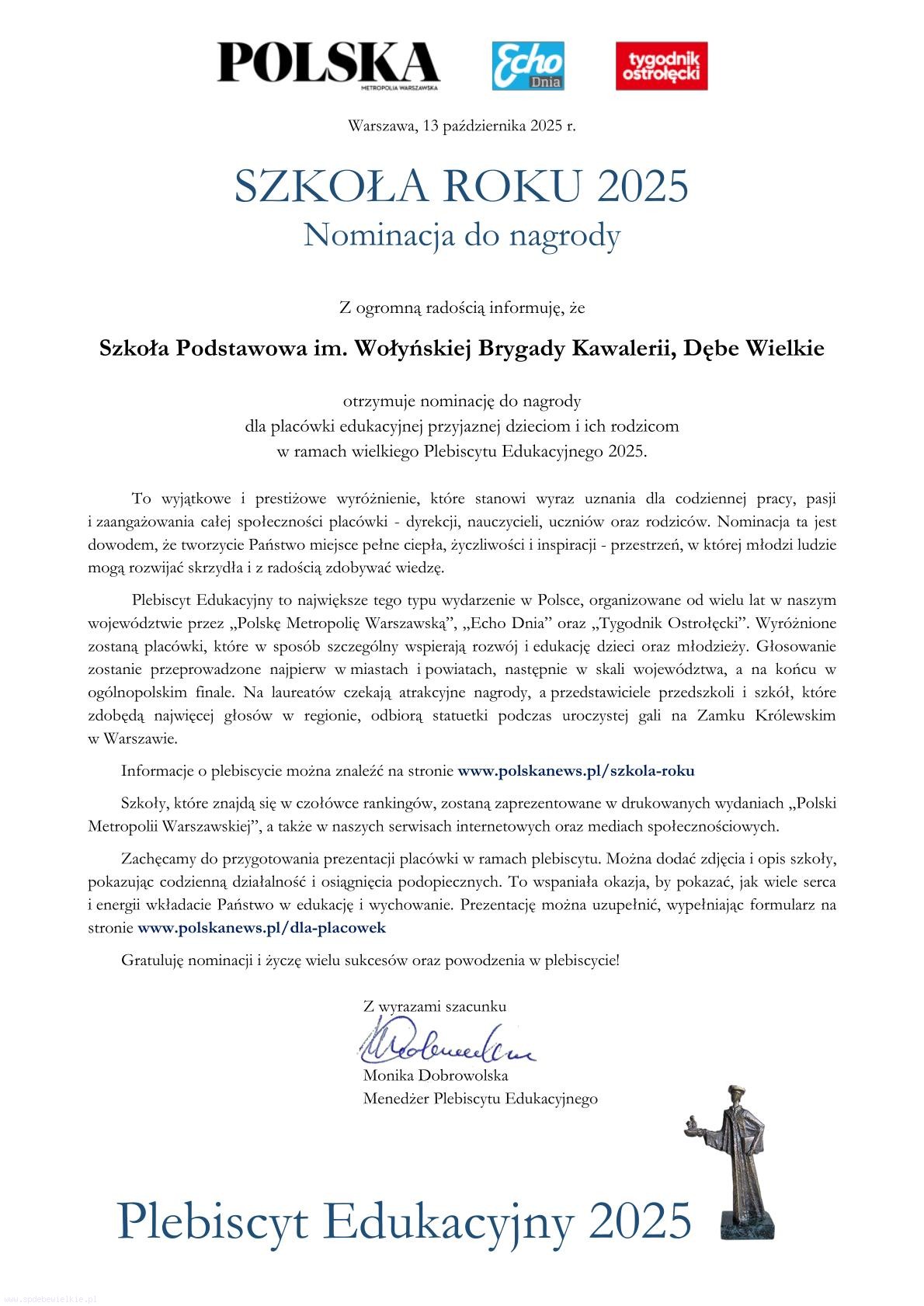 Administratorem danych osobowych w Szkole Podstawowej im. Wołyńskiej Brygady Kawalerii w Dębem Wielkim jest Dyrektor