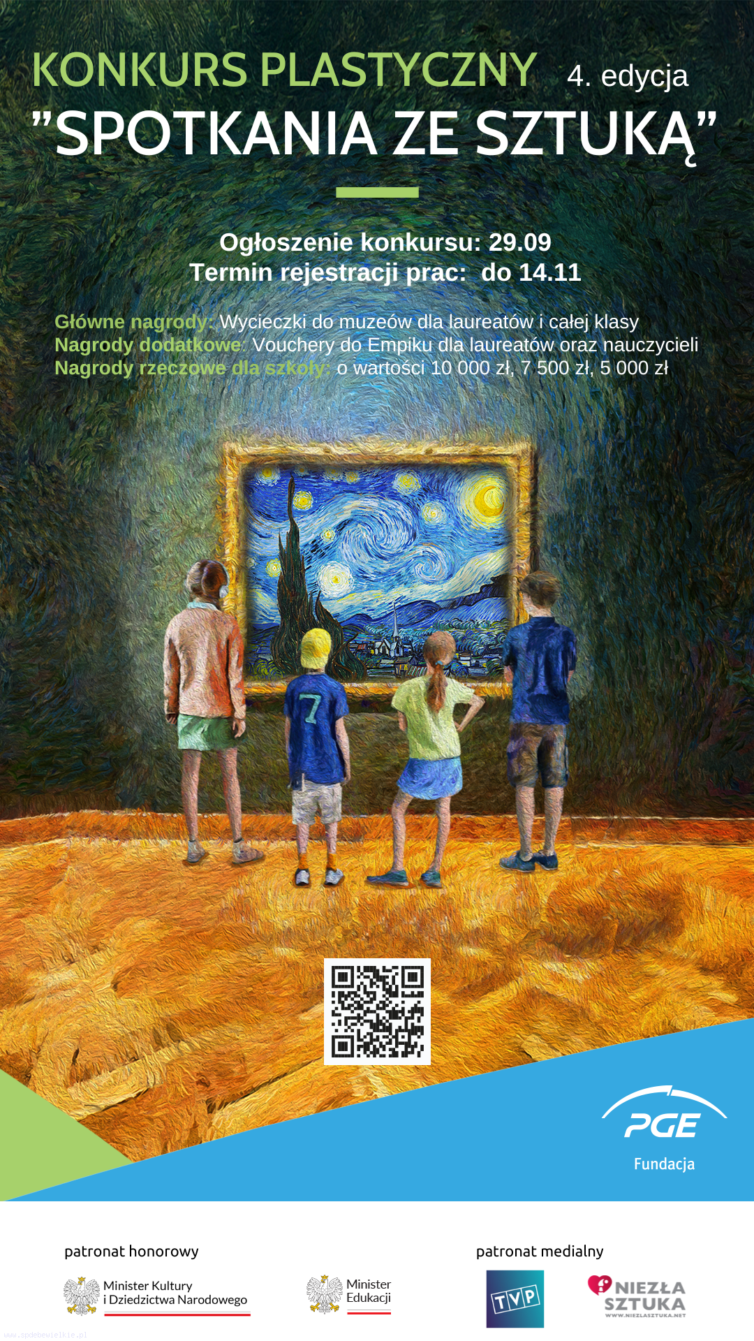 W IV edycji konkursu „Spotkania ze sztuką” zadaniem uczestników jest stworzenie własnej interpretacji wybranego obrazu Vincenta van Gogha – artysty, którego styl i emocjonalna głębia stanowią doskonałą inspirację dla młodych twórców. Prace powinny być wykonane w formacie A2, na papierze technicznym, w technice dowolnej: od ołówka, kredki, flamastra, przez farby (akwarelowe, olejne, akrylowe), po węgiel czy wycinankę. Każda klasa zgłasza tylko jedną pracę konkursową – wyłonioną w ramach wewnętrznych eliminacji – którą należy dostarczyć do organizatora do 14 listopada 2025 r. Prace będą oceniane w trzech grupach wiekowych: klasy I–III, IV–VI oraz VII–VIII, według kryteriów takich jak: zgodność z tematyką, estetyka wykonania i oryginalność.