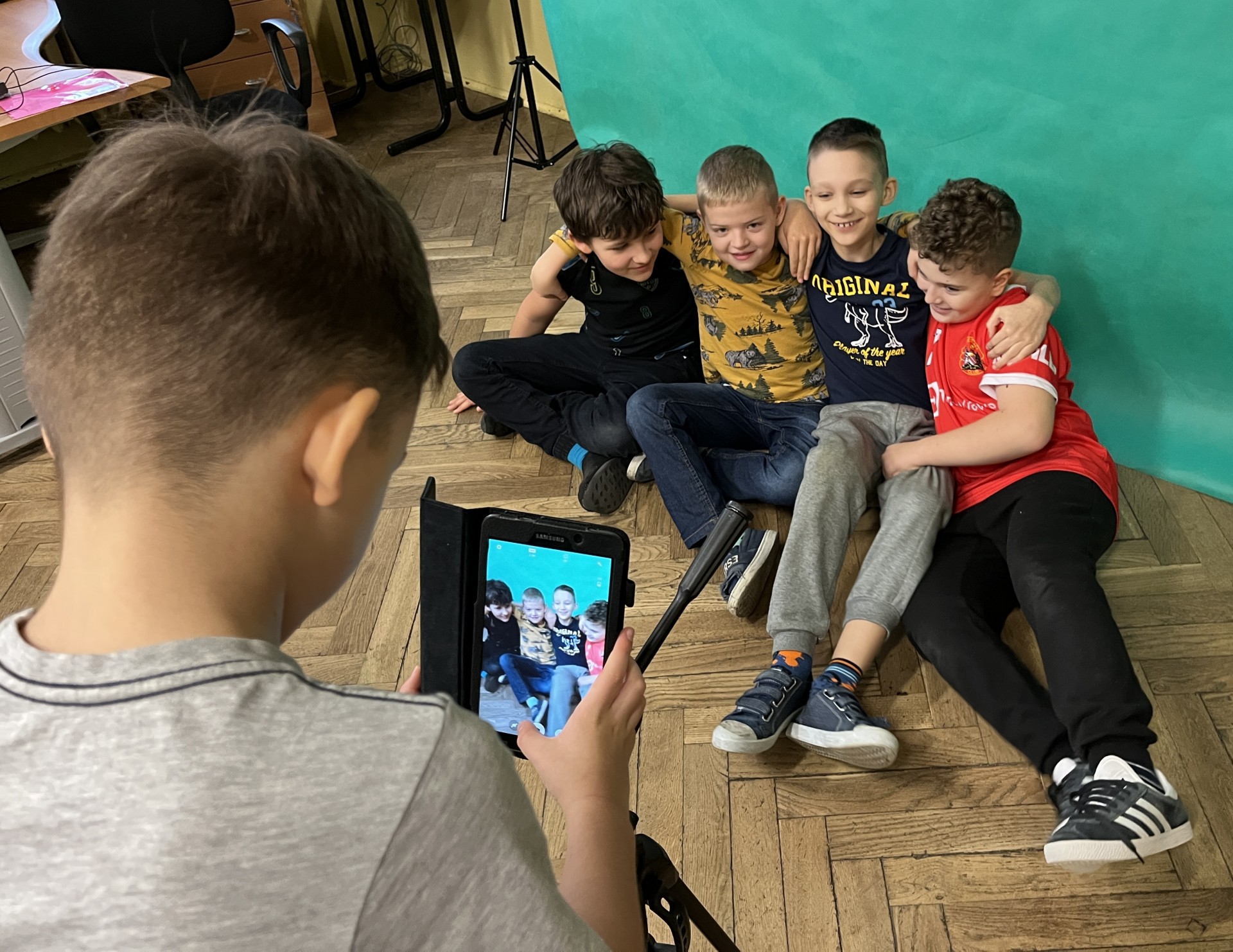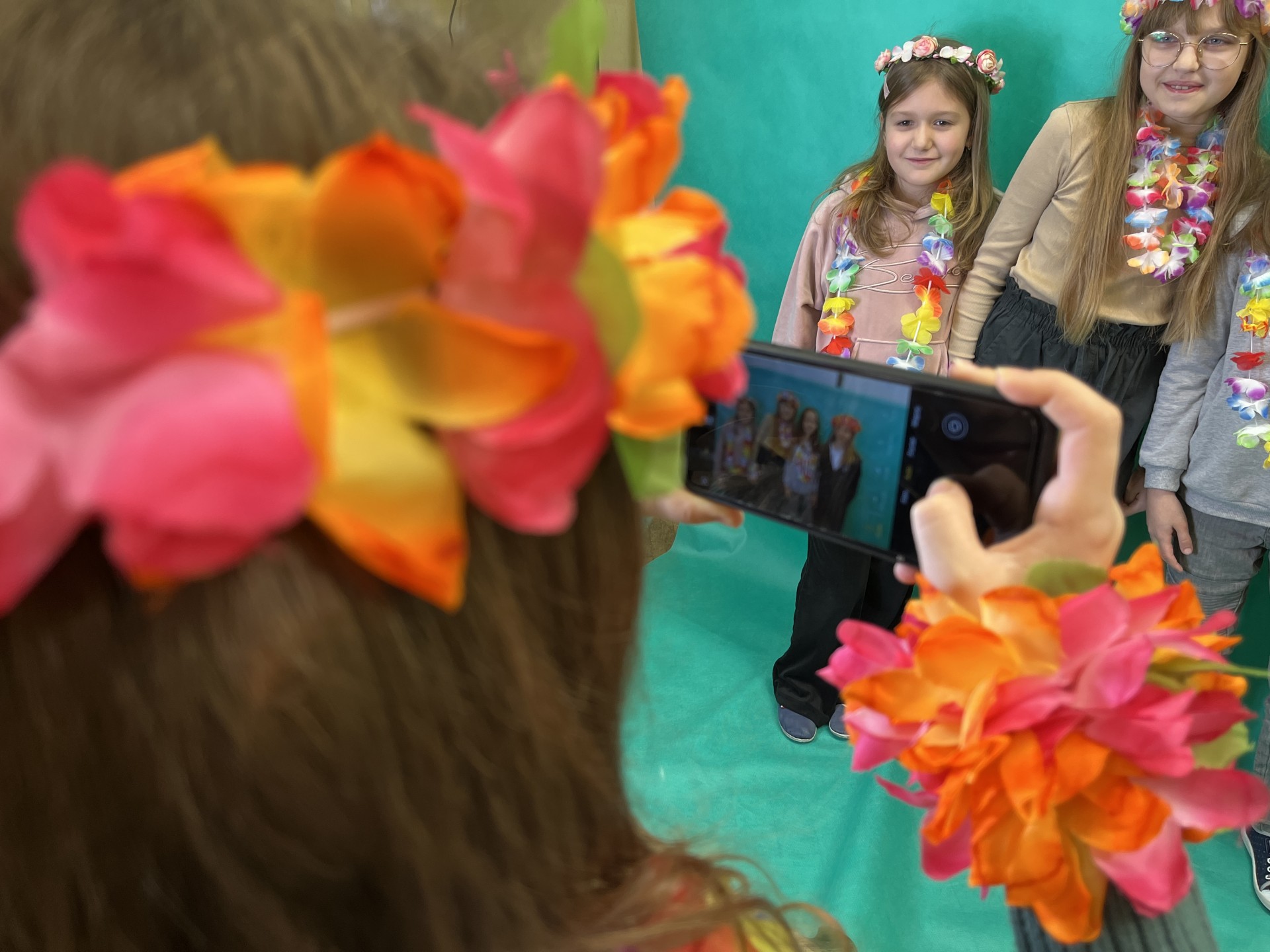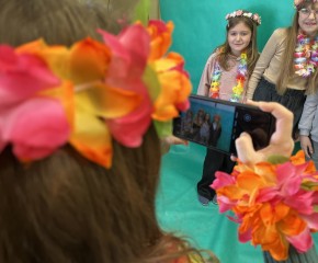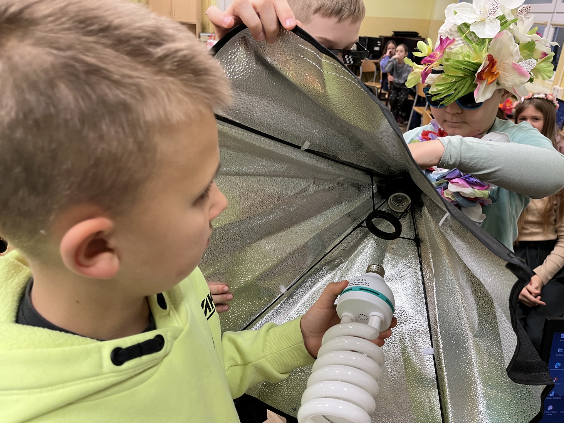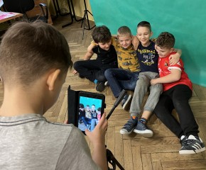 Korzystamy ze sprzętu fotograficznego. Najbardziej przypadły nam do gustu zabawy z green screen, dzięki któremu z sali lekcyjnej możemy się przenieść, gdzie tylko chcemy. Wystarczy, że zrobimy sobie zdjęcie na zielonym tle, a następnie w programach do obróbki zdjęć, zamiast zielonego tła wkleimy dowolną grafikę. Nie zawsze nam wszystko wychodzi idealnie, ale najważniejsze, że próbujemy.