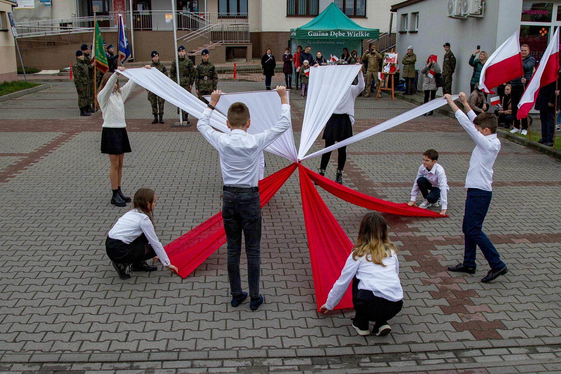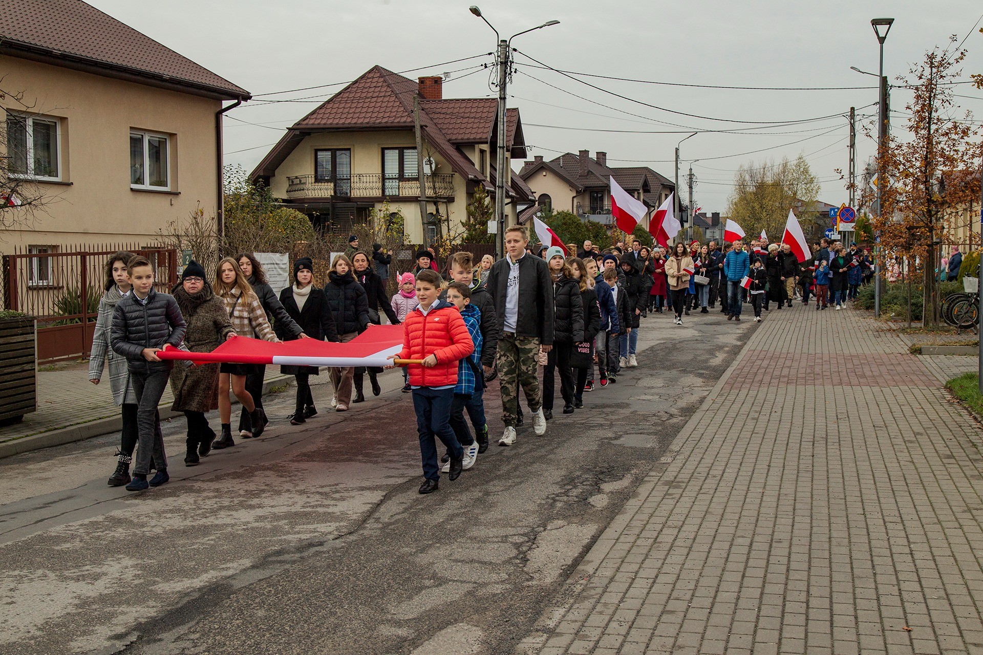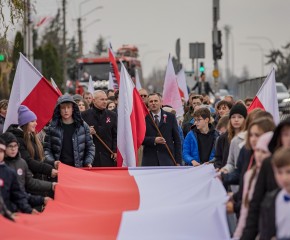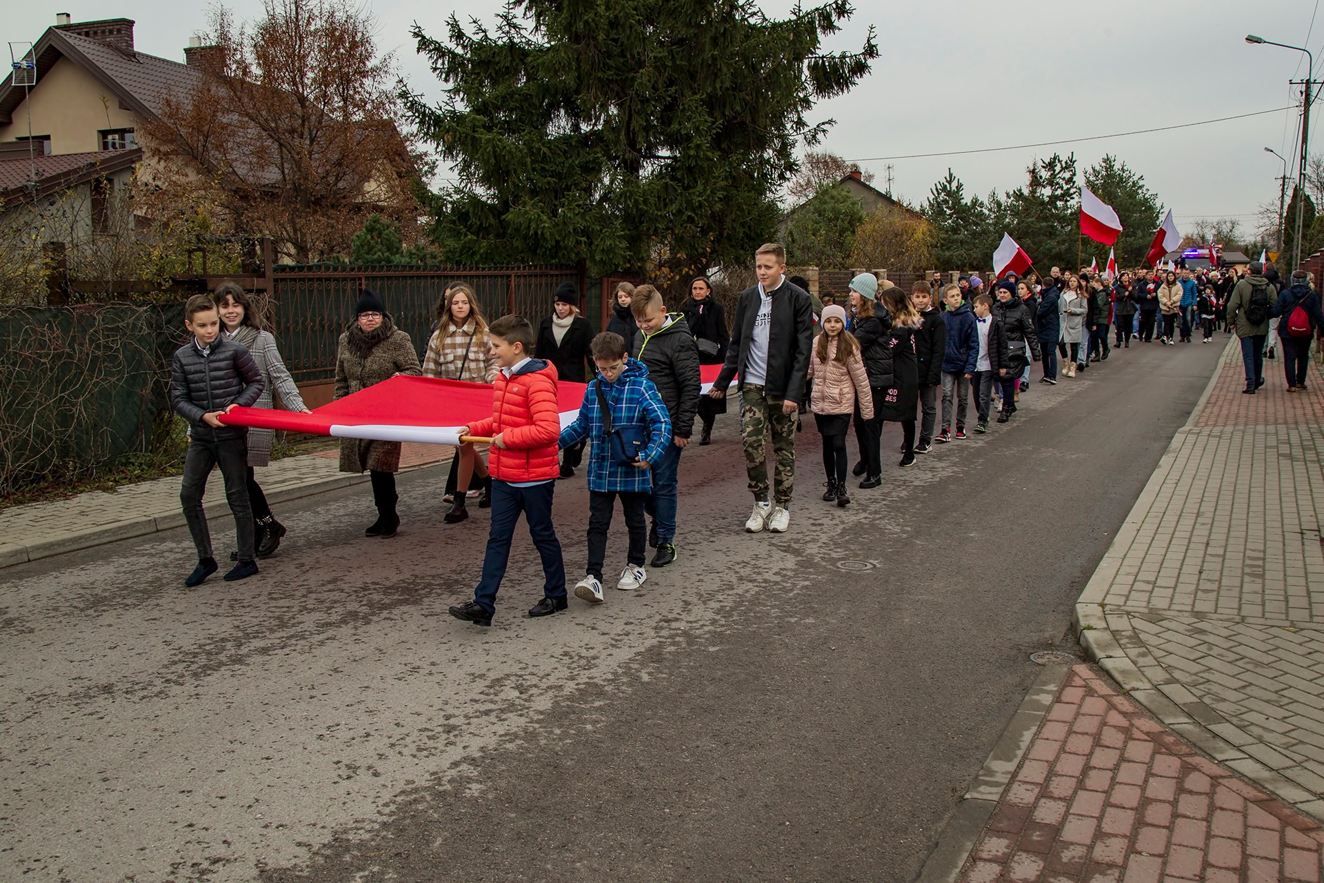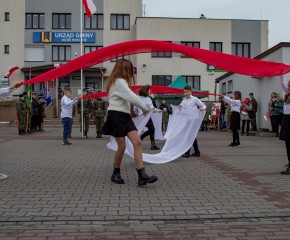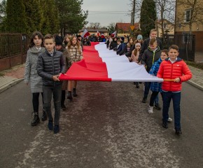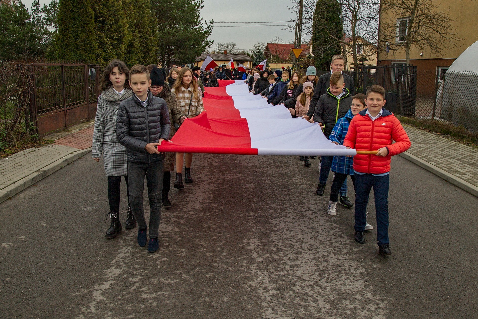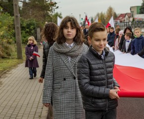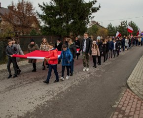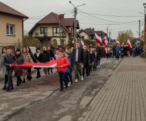 Marsz Niepodległości ulicami Dębego Wielkiego zakończony wspólnym odśpiewaniem hymnu państwowego oraz przepięknym tańcem z flagami w wykonaniu uczniów z klasy Vb.