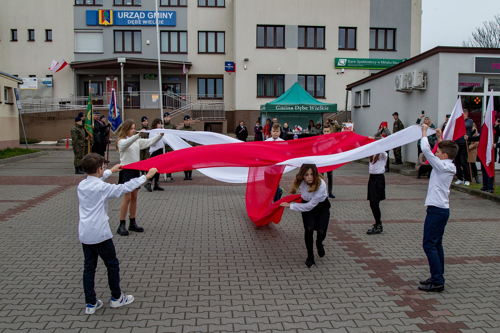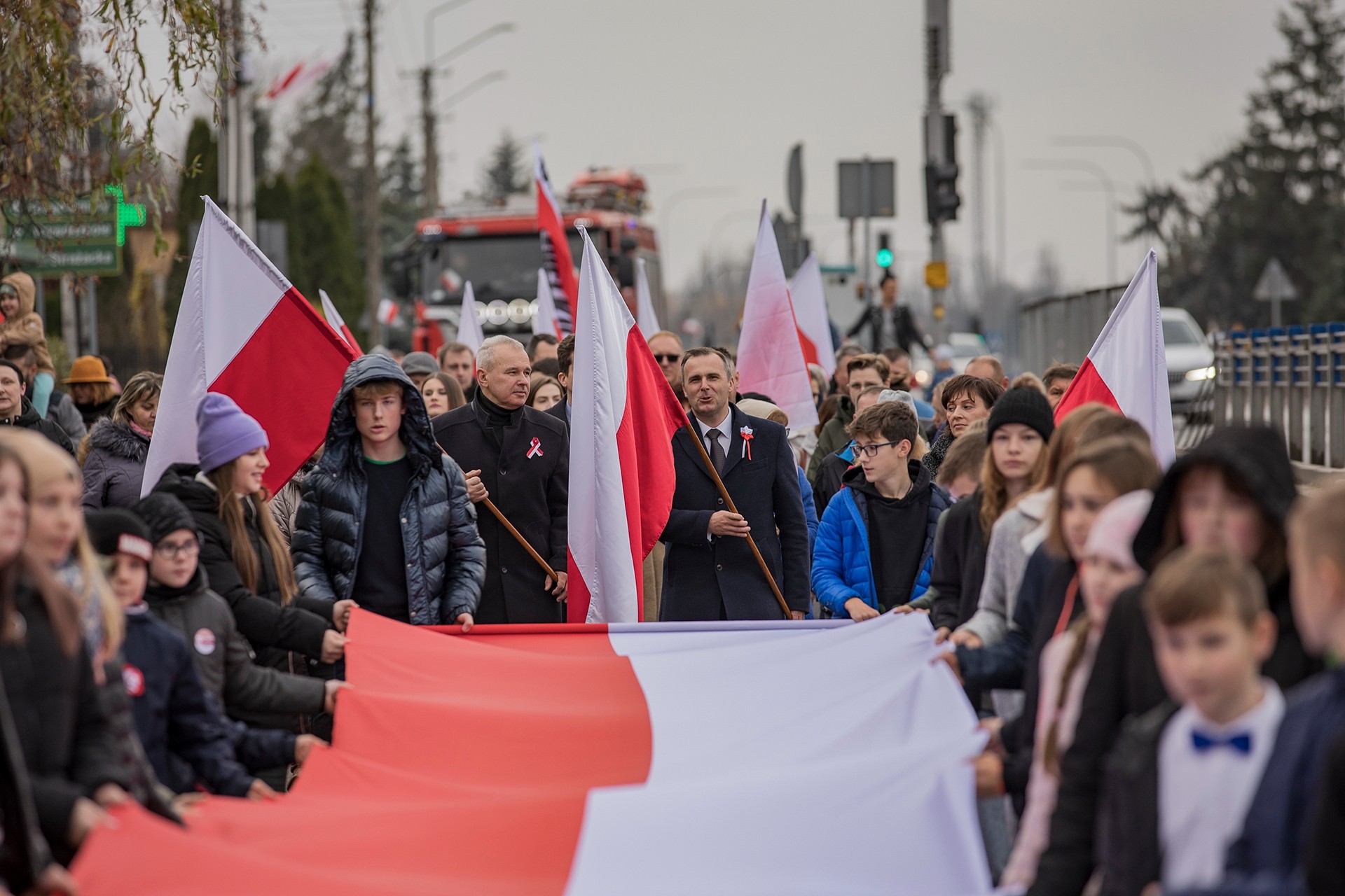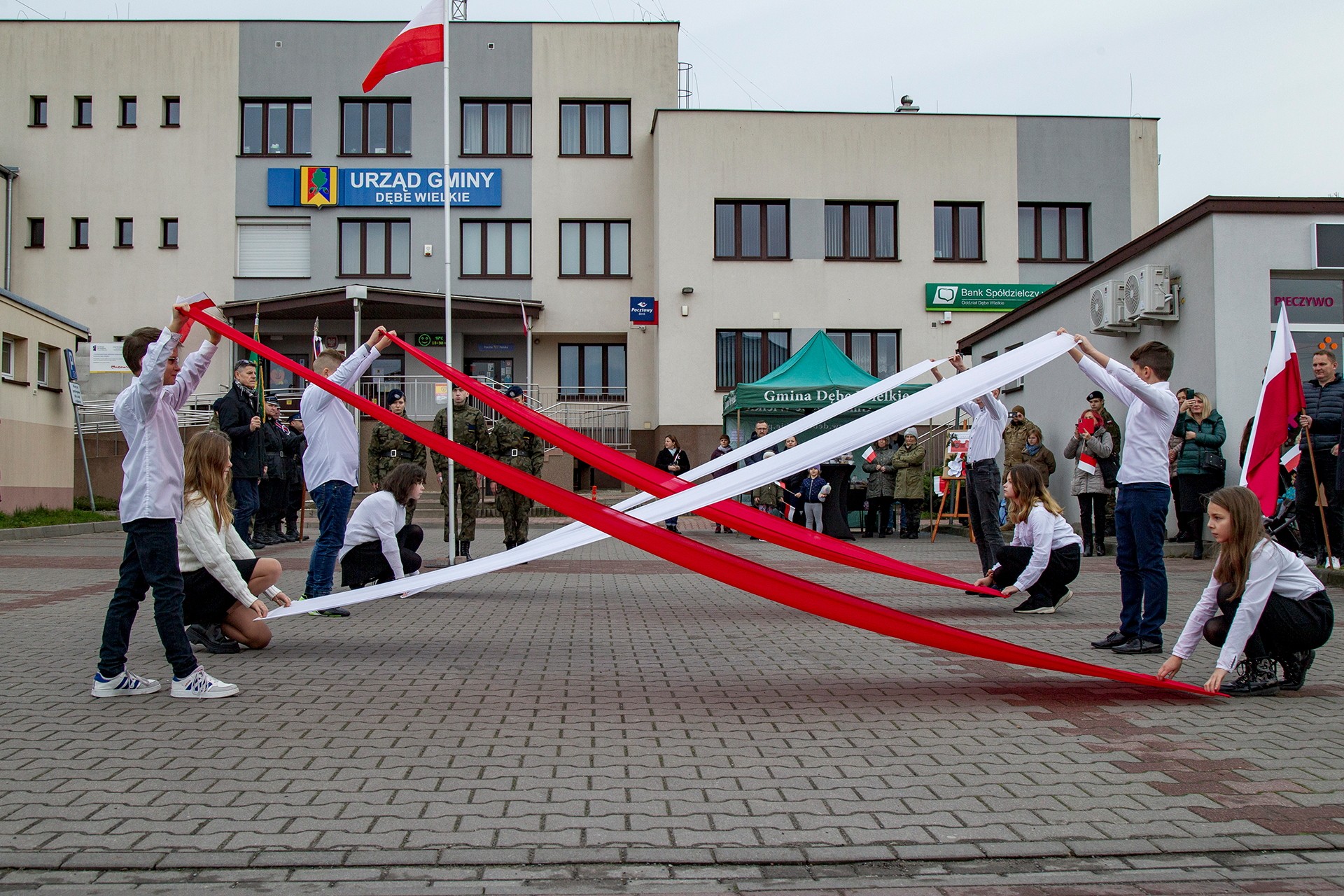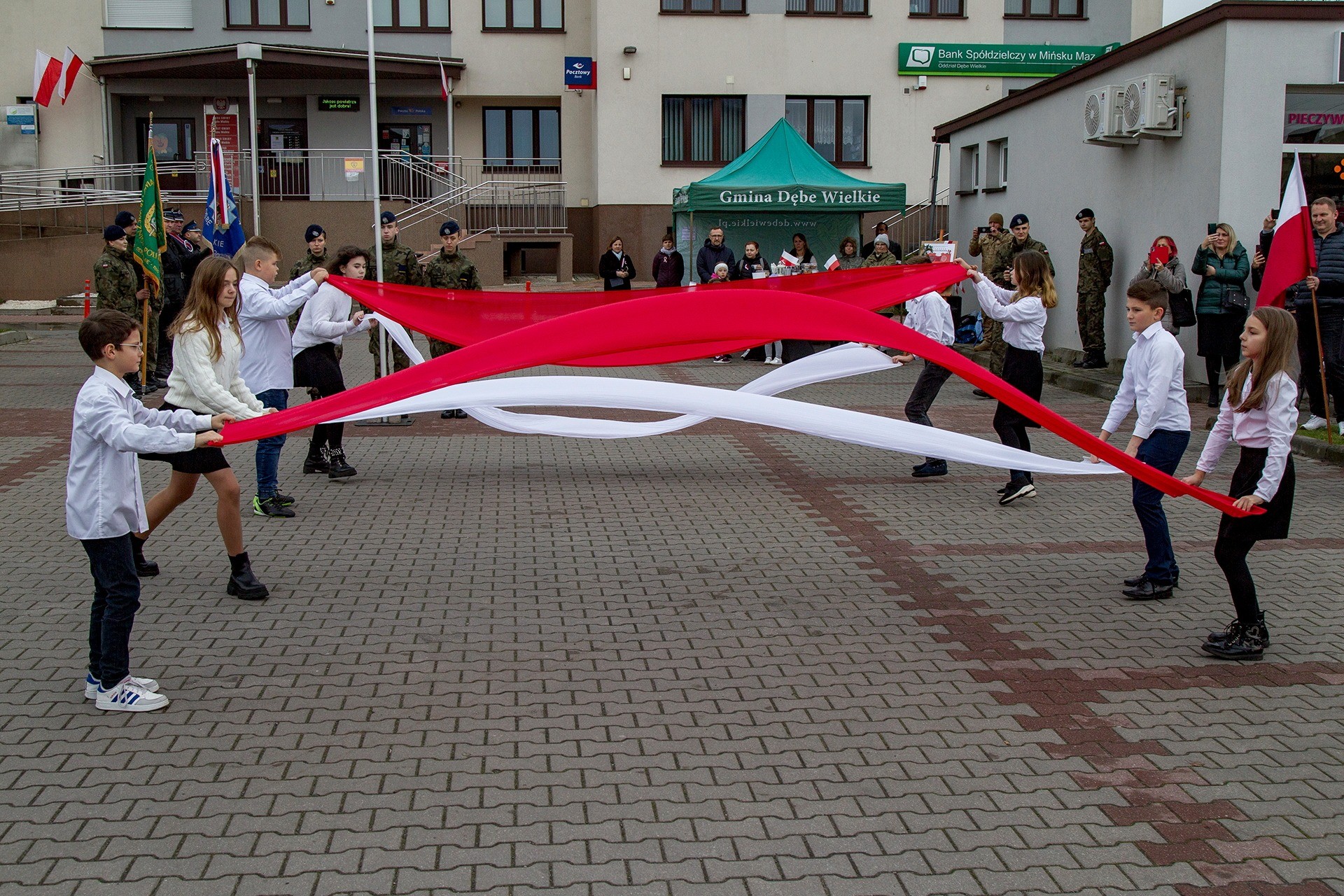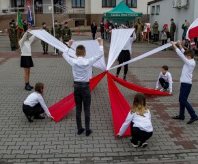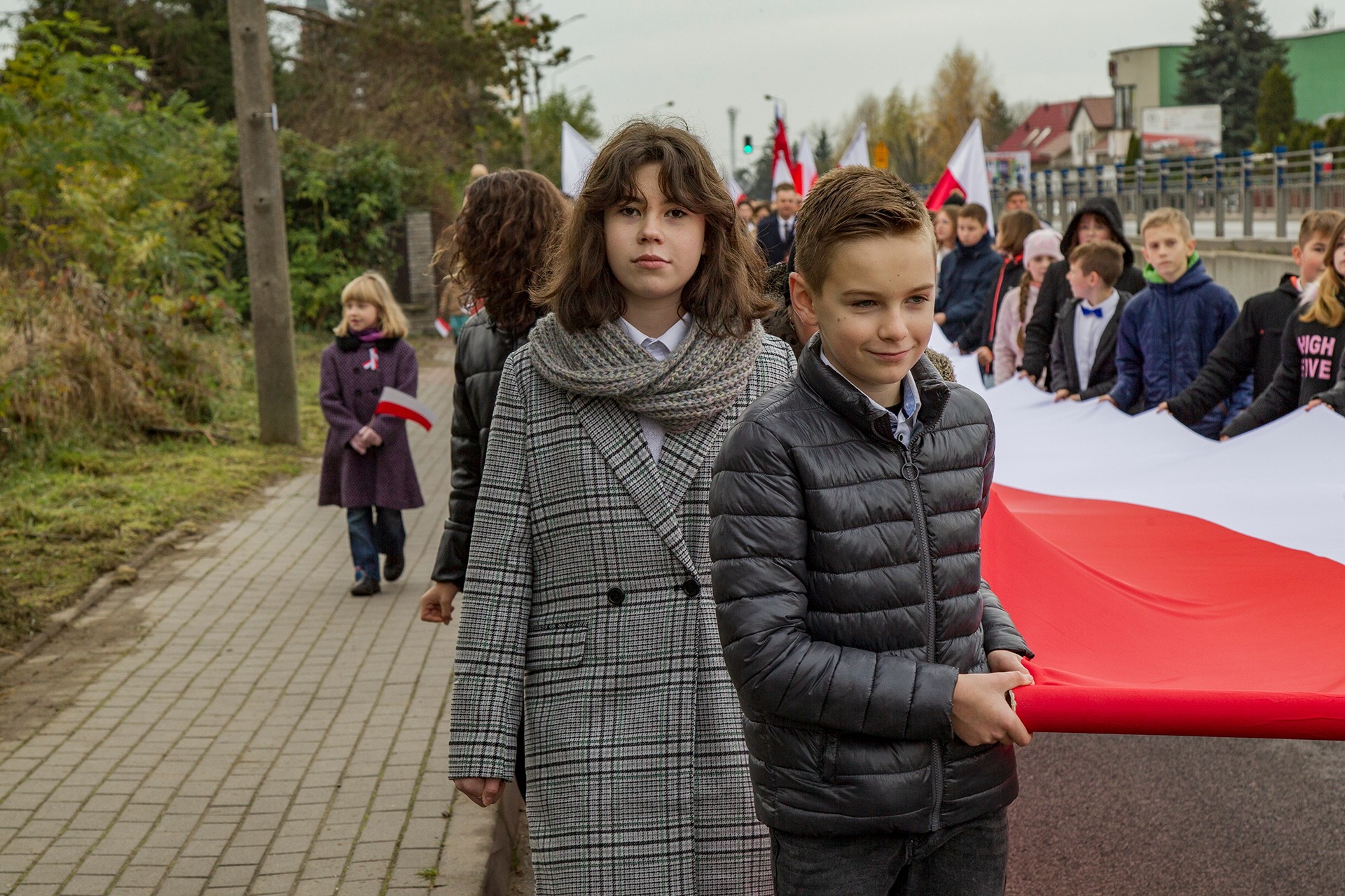 Marsz Niepodległości ulicami Dębego Wielkiego zakończony wspólnym odśpiewaniem hymnu państwowego oraz przepięknym tańcem z flagami w wykonaniu uczniów z klasy Vb.