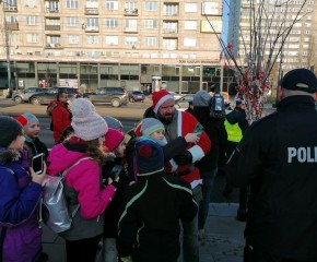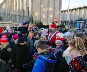 6 grudnia chętni uczniowie z klas piątych oraz 6d wybrali się na wycieczkę do Warszawy. Program wyjazdu był na tyle zróżnicowany, że każdy mógł znaleźć coś dla siebie. Jeszcze przed wejściem do Muzeum Narodowego czekała pierwsza, choć niezaplanowana niespodzianka. Nasze autokary zatrzymały się bowiem nieopodal patrolu policji biorącego udział w akcji „Mikołajki z ruchem drogowym”. Funkcjonariuszom towarzyszył aktor Tomasz Oświeciński, który wcielił się w rolę świętego Mikołaja. W ramach akcji policjanci przygotowali nie tylko słodycze ale i rózgi, które rozdawali łamiącym przepisy uczestnikom ruchu drogowego. Oczywiście nasi uczniowie otrzymali od funkcjonariuszy jedynie same słodkości, a pan Tomasz chętnie pozował do zdjęć i rozdawał autografy.