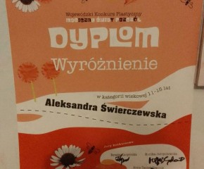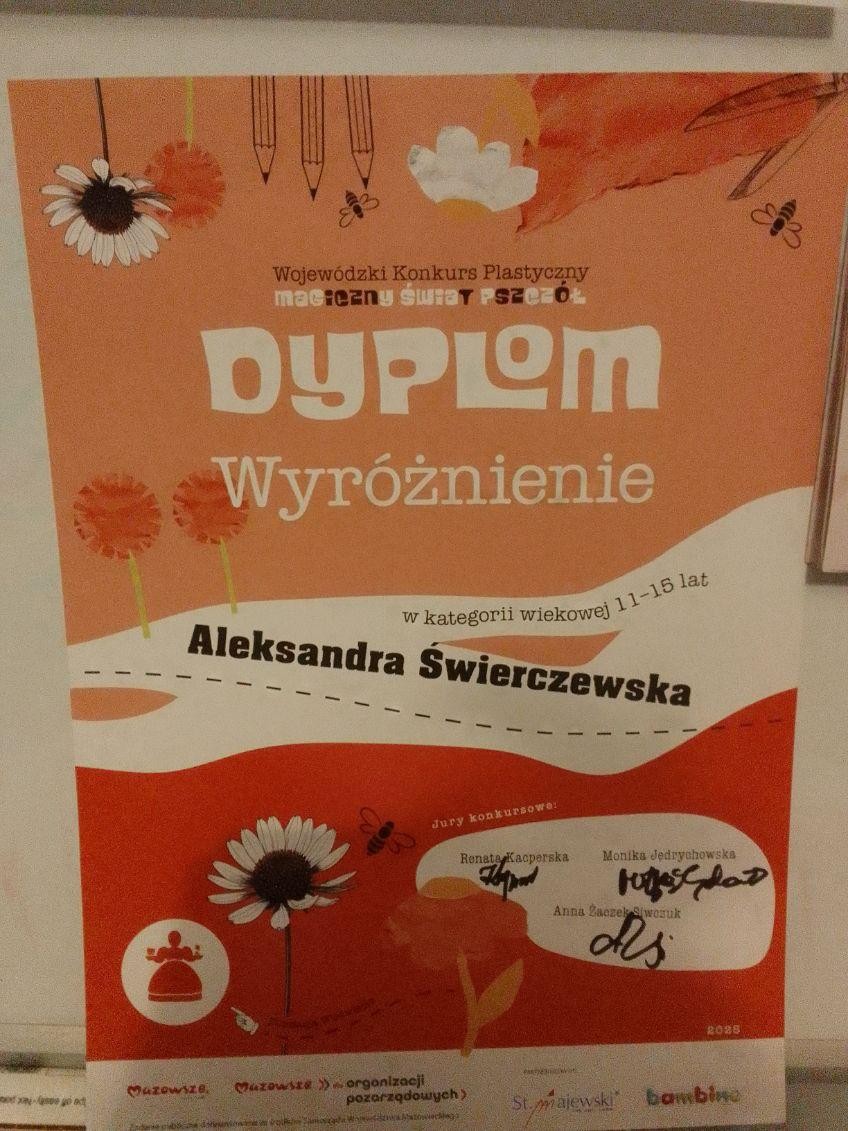 Aleksandra Świerczewska ,uczennica klasy VI,zdobyła wyróżnienie w Wojewódzkim Konkursie Plastycznym ,,Magiczny świat pszczół ".