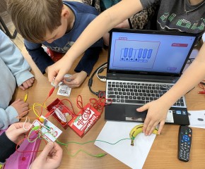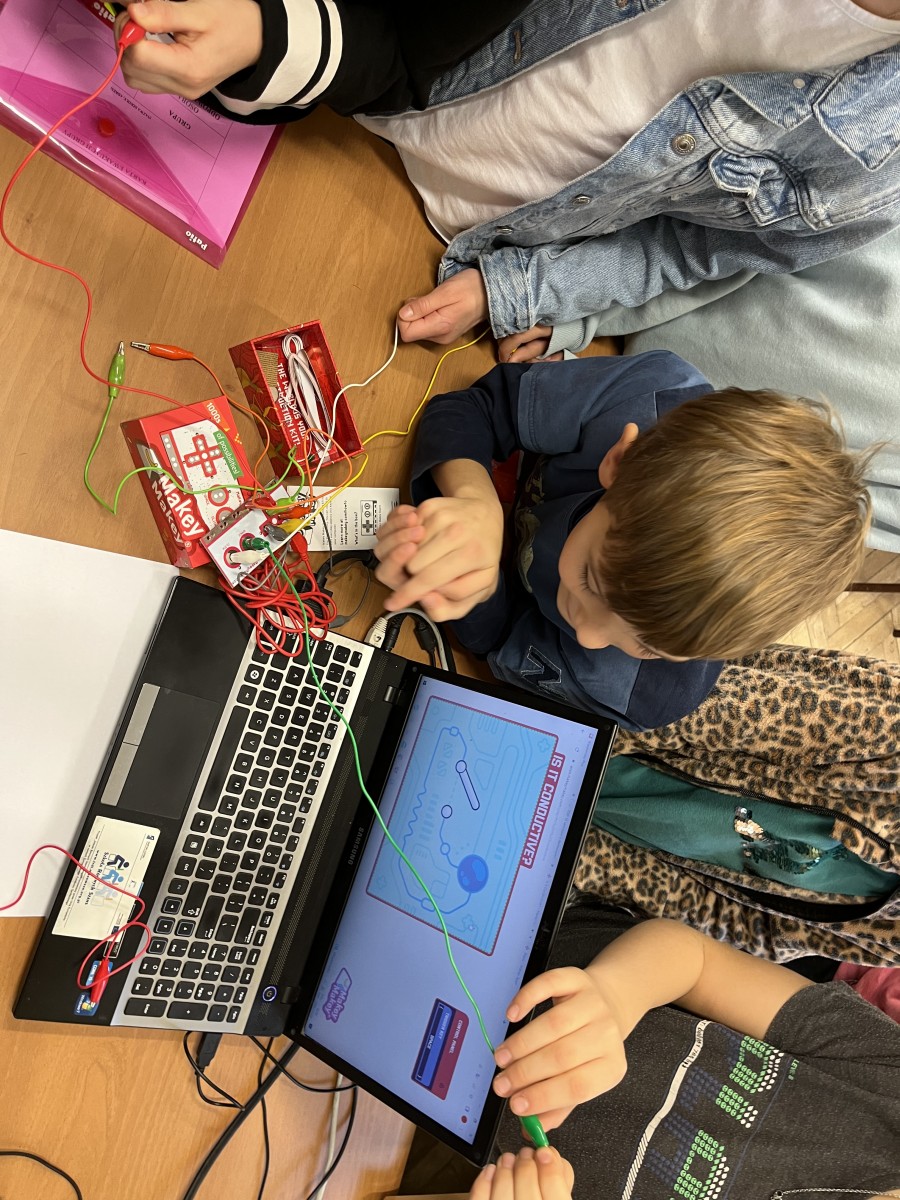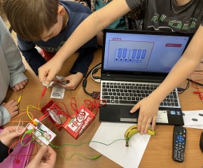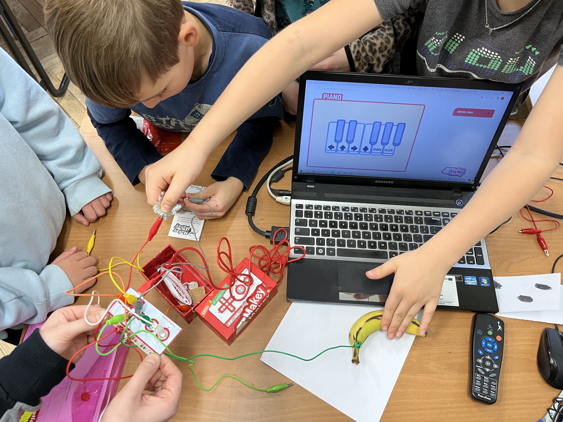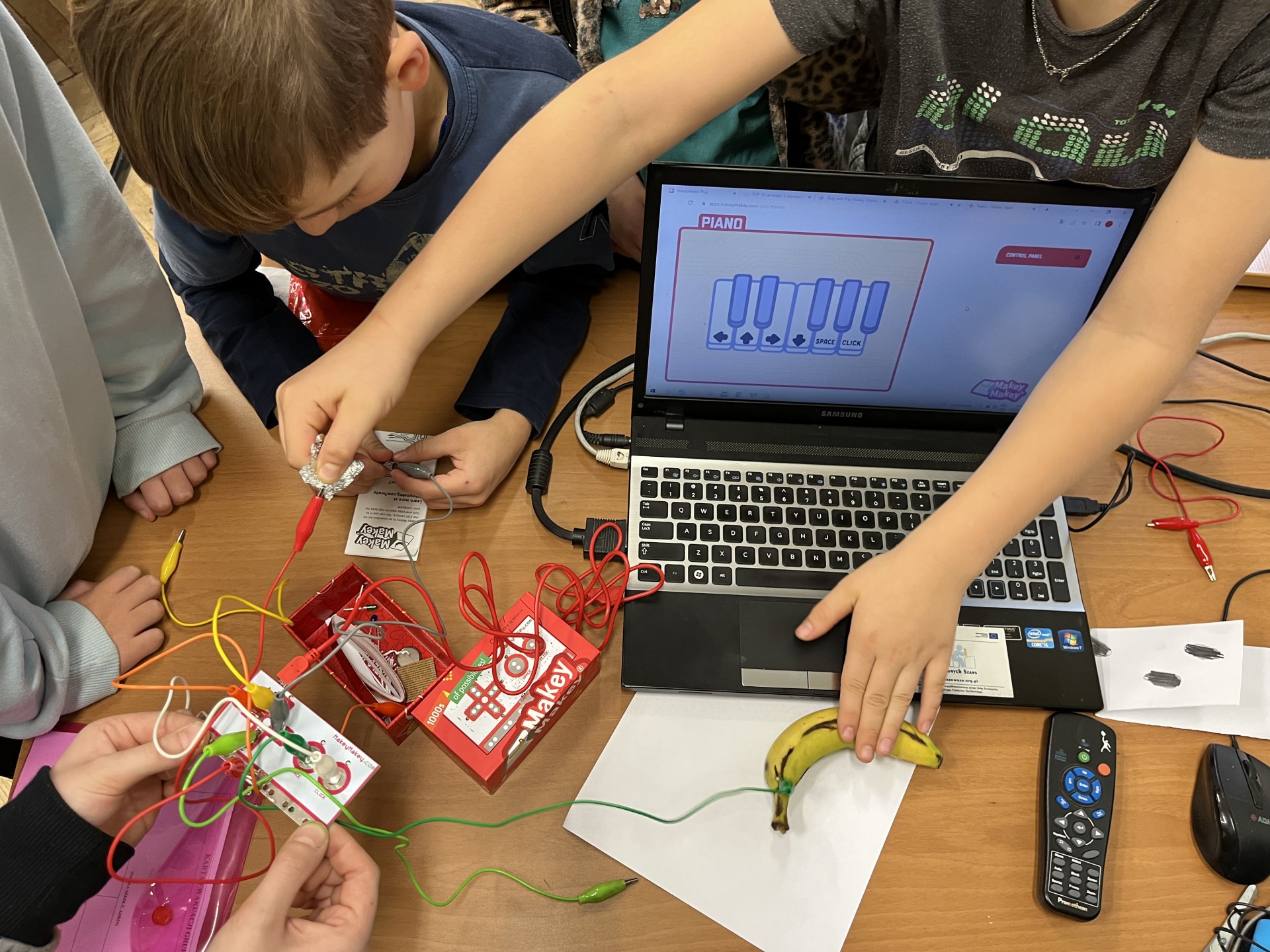 Makey Makey to płytka i nietypowy Midi kontroler. Choć wygląda niepozornie zastosowań na lekcjach może mieć dziesiątki. Na lekcjach informatyki uczniowie klas 2 i 3 poznali zasady działania obwodu zamkniętego z wykorzystaniem Makey Makey. Wykonali doświadczenia, co przewodzi prąd. Zbudowali łańcuch z siebie by sprawdzić, czy uda się zamknąć obwód. Dzieci dowiedziały się, że w pianino można zamienić, co tylko się chce. Najlepsze okazały się banany. Uczniowie poznali zasady bezpiecznego postępowania z prądem, poprzez eksperymenty.