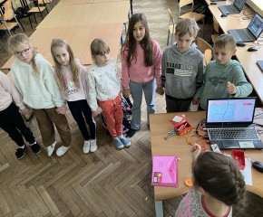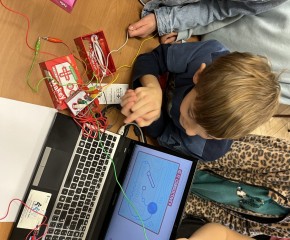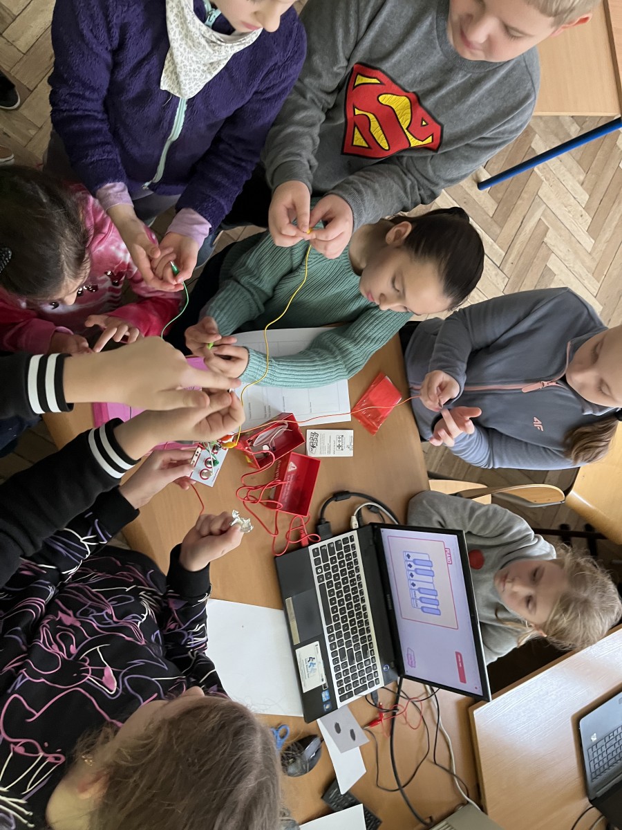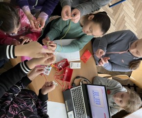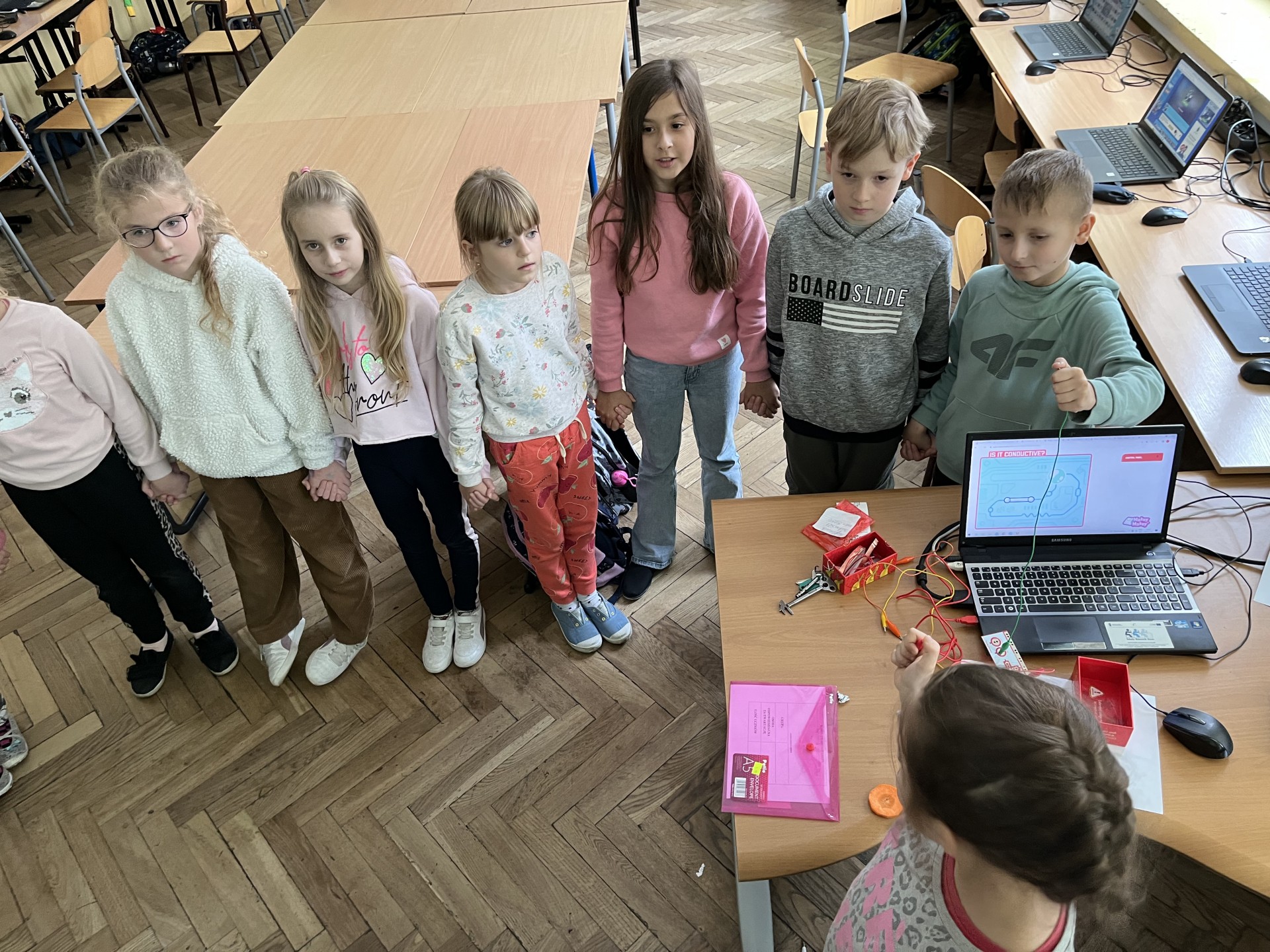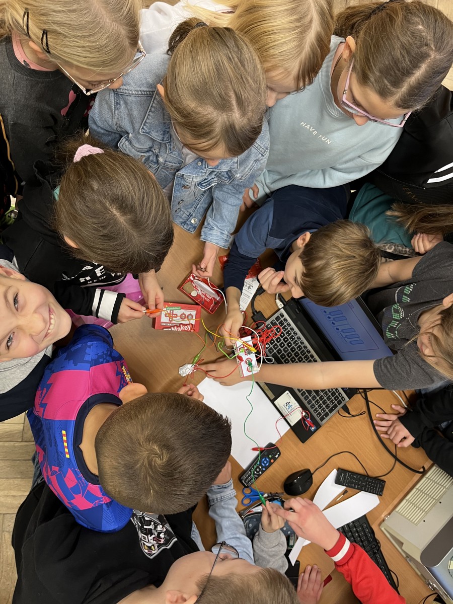 Makey Makey to płytka i nietypowy Midi kontroler. Choć wygląda niepozornie zastosowań na lekcjach może mieć dziesiątki. Na lekcjach informatyki uczniowie klas 2 i 3 poznali zasady działania obwodu zamkniętego z wykorzystaniem Makey Makey. Wykonali doświadczenia, co przewodzi prąd. Zbudowali łańcuch z siebie by sprawdzić, czy uda się zamknąć obwód. Dzieci dowiedziały się, że w pianino można zamienić, co tylko się chce. Najlepsze okazały się banany. Uczniowie poznali zasady bezpiecznego postępowania z prądem, poprzez eksperymenty.